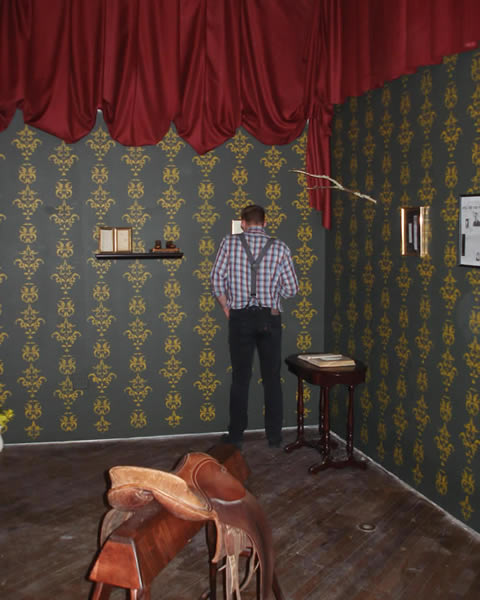 Where the show runs into difficulties is in the presentation of the art objects. The films play in a space decorated with hand-made wall paper and drapes that evoke a semi-historical context. A small number of objects that were used in the making of the films are also presented without labels or explanation. A saddle, bronze baby shoes, a dueling pistol, a dictionary and a stick—about eight items are strewn about in a largish space. Without a thorough understanding of the stories outlined in the songs and films there is no way for a viewer to connect these items to one another or to the newspaper stories that inspired it all. I spent a lot of time trying to puzzle out how each item fit into the show and being distracted by subtle anachronisms in the objects themselves. I’d prefer the show either without the objects or with wall tags to provide more information about how they connect to the overall story.