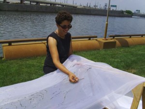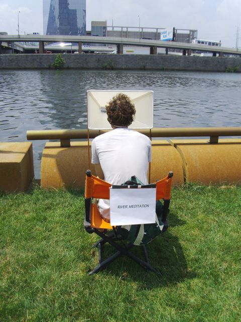 The idea is pretty simple: get together a bunch of artists and have them make their art in public, in this instance with the Schuylkill River as their studio. 35 different artists working in a variety of media came together and spread themselves along the banks of the river. The emphasis was on public participation.