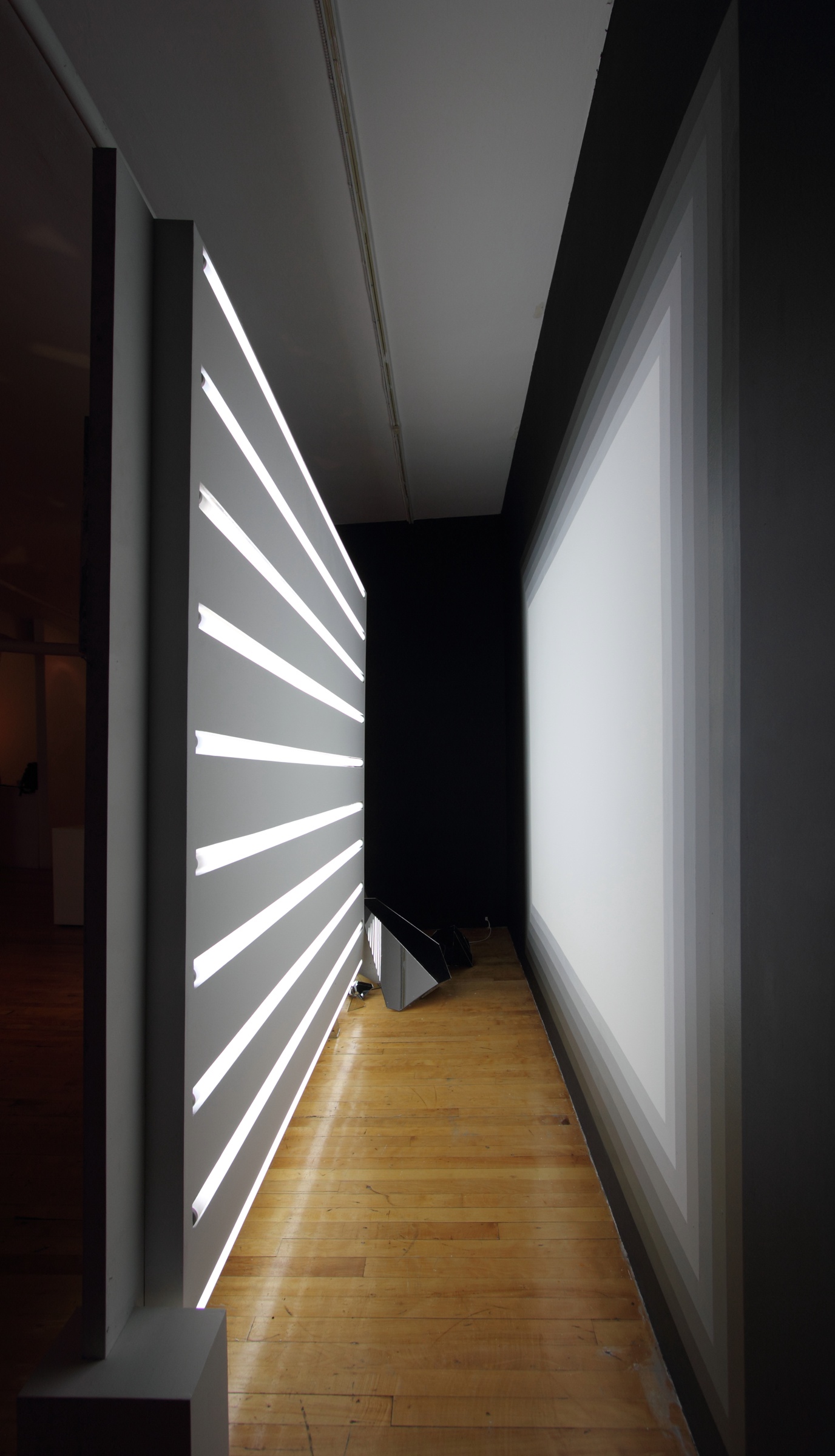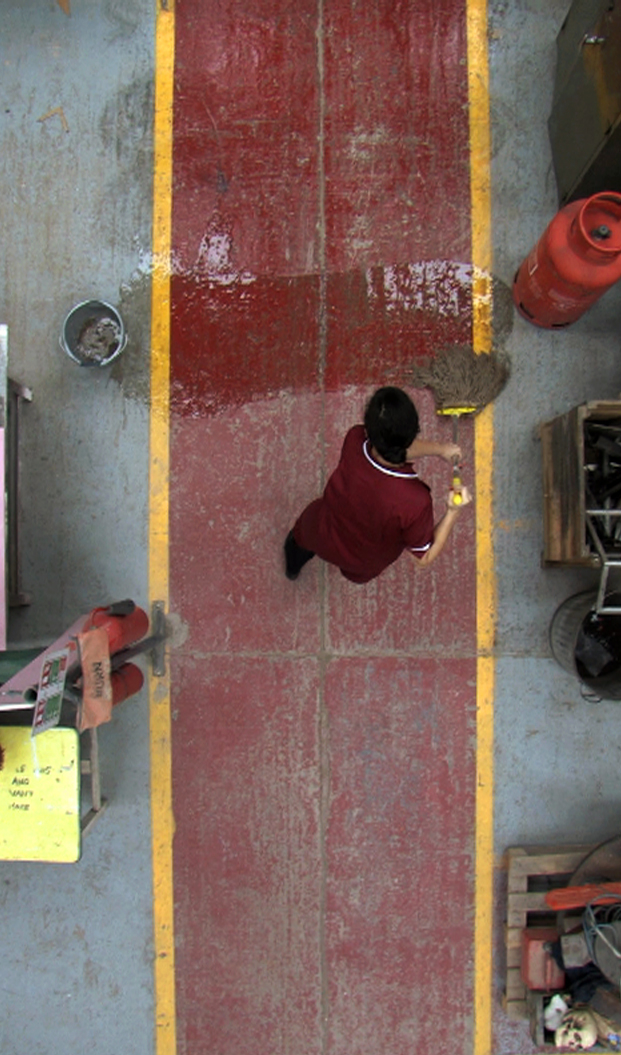 Besides Brittany Pratt’s reframing of the BP oil spill as impossible art project (Hommage to Smithson and Pollock; 2010), the most compelling piece, in my opinion, was Alana Riley’s video Who’s Afraid of Red, Yellow and Grey (2009-2010). In this work, the camera pans overhead as the artist mops the concrete floor of a workspace with a large central red-painted passageway bordered by two yellow stripes. The image slowly travels down, the central band a continuous loop, the mop-laden artist slowly coming into view and slowly disappearing. Extrapolated from the formal act of painting, the artist here takes on the same central gesture.