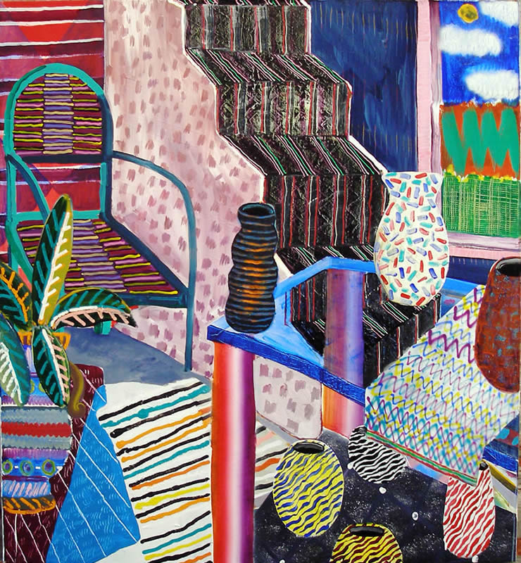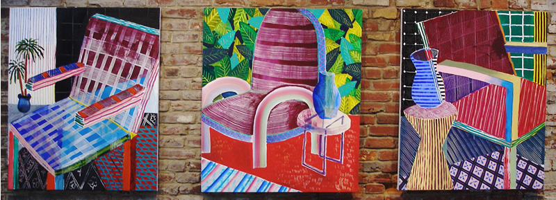 Jolie Laide, a new gallery near City Hall on Juniper Street, opened the doors to their first show with the brightly-colored, funny and melancholy works of Kevin Baker, Tom Costa, and Austin Eddy—the decorative, the decayed, and the domestic. The large new space is bright and welcoming with exposed brick and open space in the front room and italian plaster walls in the rear gallery. It provides an interesting architectural background for the current show which features both architecture and interiors. Although Jolie Laide already represents local artist Jordan Griska, their debut show highlights experienced, but little-known artists that are new to the Philadelphia art scene.