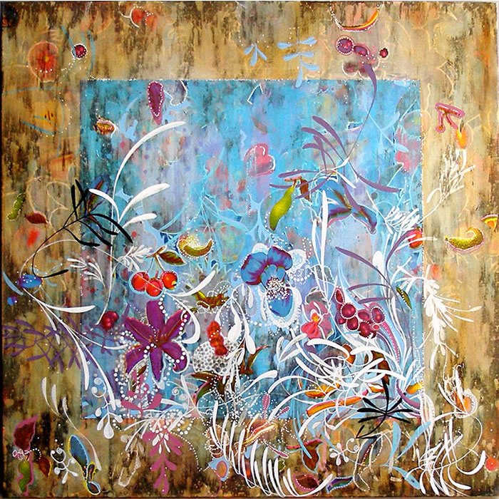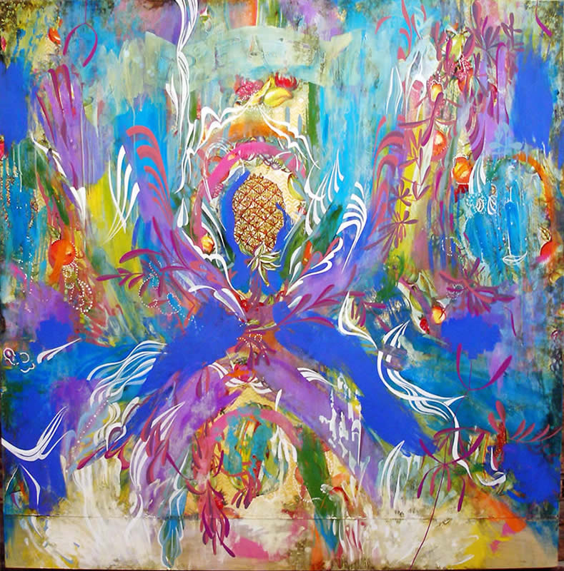 Kevin Baker (NYC) paints on oil cloth print; his decorative motifs, reminiscent of Indian miniatures, surround the oil cloth’s floral and fruit elements that frolic in an abstract swirl. The works range from two foot to four feet in width and are mostly unframed showing off the unembelished oil-cloth print on the sides. This glimpse of the works’ substrate is echoed in some of the paintings where Baker has scraped the paint away from the cloth surface, allowing the imagery from the prints to participate in the painting, as is the case with the titular figure in Handsome Fruit.