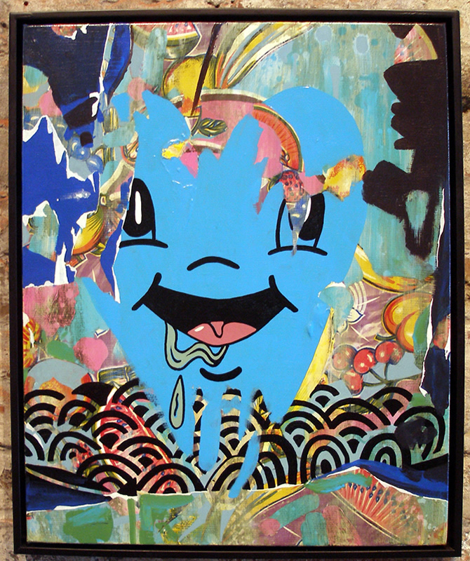 Gallery Director and show curator Travis Heck selected pieces from each artist that straddle a transition in the subject or style of their work. This shift in perspective adds depth to the show as a whole. While some of Baker’s earlier work shares a hallucinogenic quality with Odilon Redon—recognizable subjects float in a hazy, decorative dream. Other, more recent paintings incorporate comic elements and pop art figures as well as patches and staples. The painting style of Hungry Heart looks more like ripped down layers of wheat-pasted wall posters. Much more than ‘merely decorative’, there is depth in the layers and satisfaction in the visible archeology of the creative process.