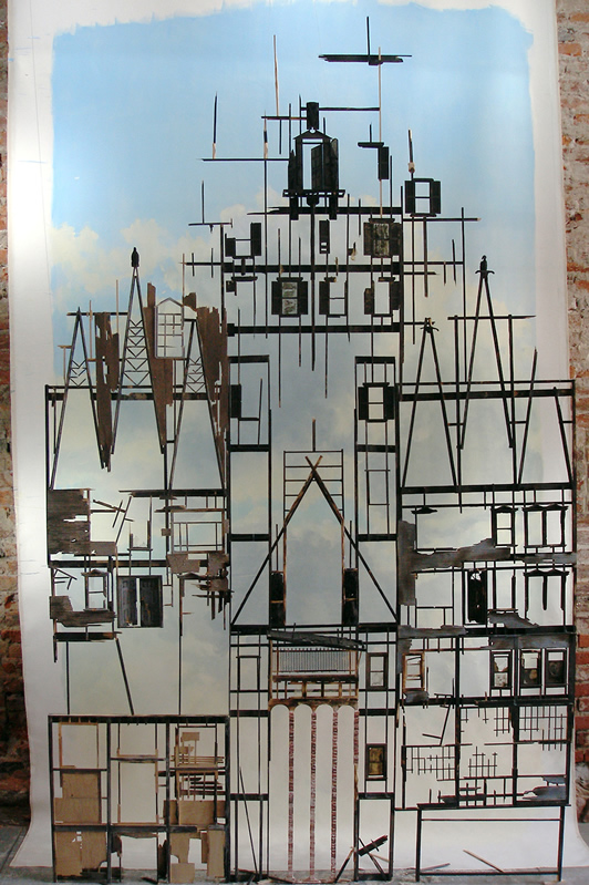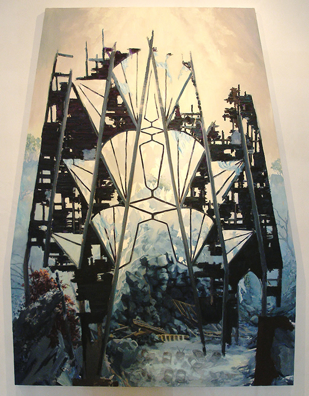 Brooklyn resident, Tom Costa’s paintings feature ruined building frames backlit by poetic skies. Often the canvas’ form mimics the shape of the building framework creating a container for a structure that is no longer a container. The overall image is almost romantically beautiful, like skeletal trees in winter. But there are disturbing elements in the details—small moments like the barely visible folding metal chairs in the rubble at the bottom of A High Place are reminiscent of places we have all been and they make the destruction seem more dangerous and personal.