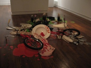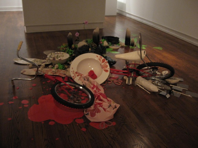 While Philadelphia artist Candy Depew has always suggested the fragility of life and the body with her decorated porcelain skulls and delicate gestural decorations, here she takes on depth, confronting death and the ways, honest and dishonest, that people memorialize others. Her Stilled Life installation is a bicycle- and skateboard-crash, with decorative pools of blood scattered at the crash site. Behind the remnants of the crash is an artful version of the stuffed-animal stelae that grow into dismal, rain-soaked mounds on our city streets. Depew captures at once the grief, the failure of these gestures to overcome it, and the cultural phenomenon that has made this outpouring fashionable. The room itself evokes a darkened funeral parlor, decorated with Depew’s usual baubles, which call into question the whole urge to decorate our path to the grave.