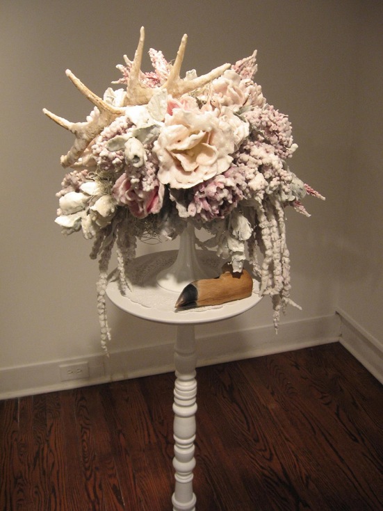 I swore never again to write about art work with dying deer symbolic of a lost environmental paradise, but Katherine Kaminski (Peoria) convinced me with her kitsch-inspired sculptures of sugar-coated funerary arrangements. A deer heart sculpture under a bell jar embedded in a sugary Victorian bouquet is shocking. In the drawings, the deer and the dear little girls take on each other’s identities and the scenarios contain surreal elements. That these drawings, which would be right at home in Art Star, overcome their kitsch conventions–skulls, hearts and flowers, not to mention deer–is a credit to Kaminski.