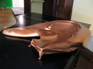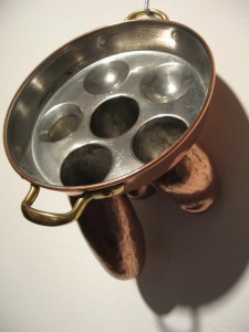 Myra Mimlitsch-Gray’s excellent metal sculptures begin with found, fancy metal utensils and servers that she transforms to suggest a threat that no amount of housekeeping or propriety can overcome. Escargot cups hang like testicles, and a chafing dish overflows with an invasive tongue. Mimlitsch-Gray (New Paltz, NY) showed a year ago at Wexler Gallery, but I don’t remember the frisson of danger that’s in the works here, the sense of skeletons in the closet and dust swept under the rug.