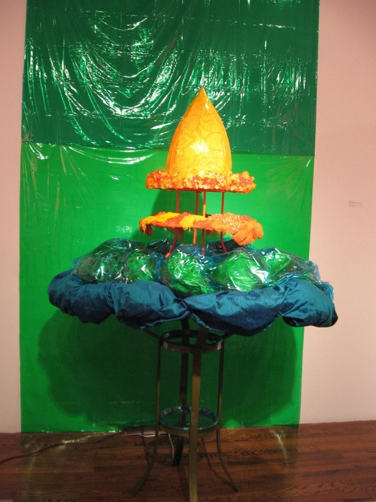 New York area artist Savannah Gae decorates a boy phallic missile and its explosion into domestic complacency, a nuclear tuffet. I got a Middle Eastern vibe from its architectural form. But it’s nearly lost in the room between two other pieces–girly cakes about 5 feet in diameter and 7 or 8 feet high–extreme dressing tables, piled high with boxes and crowned and draped like four-poster beds with fabric and cellophone. The hair clips and beads, the colors and glitz, suggest teenage girls unaware of the ephemeral nature of their beauty as they play at reinventing themselves with makeup and fashion. But like the girls, these pieces feel as if they are incomplete, even with their layers of gewgaws and spectacle.