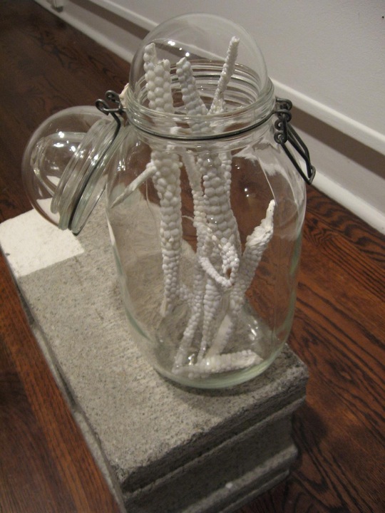 Less satisfying are Brooklyn artist Audrey Hasen Russell’s stacked, blown glass pileups, the potential to suggest domestic fragility undermined by a visual stinginess and tentativeness. Only her White Stick Jar with mysterious white objects inside, resting on a cinderblock partially painted white, made me stay to think.