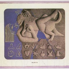 Lyons is a tall, sober man dressed somewhat anachronistically in a straw boater and bow-tie, and often has a Bible tucked under his arm. He walks up to the visitors, hands them his pamphlets and says Here, have some propaganda, and proceeds to guide them around the display, drawn from the Hokes Archive. It is, he explains, devoted to zoomorphic juncture e.g. hybrid animals whose top portion is one species and bottom portion another (like W.S. Gilbert’s character in Iolanthe who’s a fairy down to the waist and a man below).