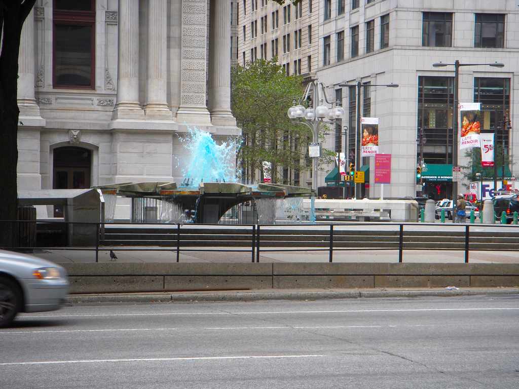 Hello, this is a wrap up of some things I saw recently that compelled me to whip out the camera — just some amusement in pictures. For starters, I’ve been following the colored water in the city’s fountains for years now — pink, green and blue — and so here’s a shot of the City Hall fountain last Thursday. Note how wild and crazy the splash is at the top of this water burst — positively ebullient! Below is a picture of another fountain, very demure by comparison, in the park behind the Upper Merion municipal building in King of Prussia. Compare and contrast, students, from all sociological and aquatic points of view.