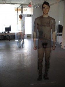 The piece de resistance is Oswald’s Liaison, a nearly life-size pair of transparencies, one printed with a man’s front, the other with a man’s back, about 6 feet apart. The two bodies are wearing invisible clothes–well transparent clothes. And the magic here is that your point of view is critical. Are they looking at one another? Are they walking away from one another? Are they both staring at you? It all depends on where you place your own body–at either end or in the middle.