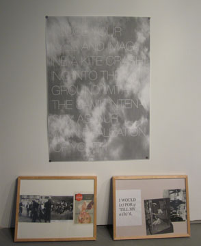 The risk with conceptual art is that formal qualities get sacrificed to the concept. Here, the arrangement of objects by the curators works well, but some of the individual pieces fail on the materials’ front. For example, Alexandr Skarlinski’s “Idea (Kite),” a black and white poster with the phrase “Close your eyes and imagine a kite crashing into the ground with the same intensity as our own realization of youth.” Propped against the wall beneath the poster, two identical wooden frames, side by side, present memorabilia of youth – photos of youthful hijinx, protest march and a flyer about a rock concert. The choice of materials and the arrangement of the parts is so low energy and expected that they drag a potentially great idea down.