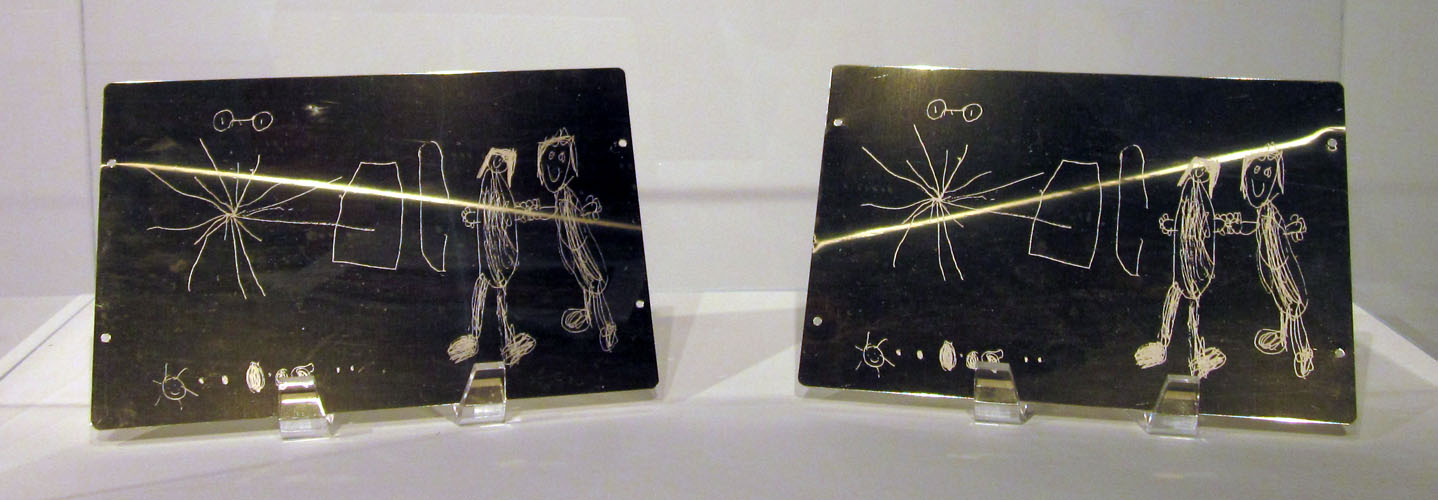 Daniel G Baird’s great works called “Pioneer 10 and 11” stand out in a show with some unevenness. Made of gold-anodized aluminum, the etched plates are the same size and material as the rebus-like message plates attached to the exterior of NASA research satellites Pioneer 10 and Pioneer 11, except for one important difference. The imagery on Baird’s plates translates the NASA image into a childlike drawing of that image. According to NASA’s website, “Pioneers 10 and 11, which preceded Voyager, both carried small metal plaques identifying their time and place of origin for the benefit of any other spacefarers that might find them in the distant future.” (http://voyager.jpl.nasa.gov/spacecraft/goldenrec.html)