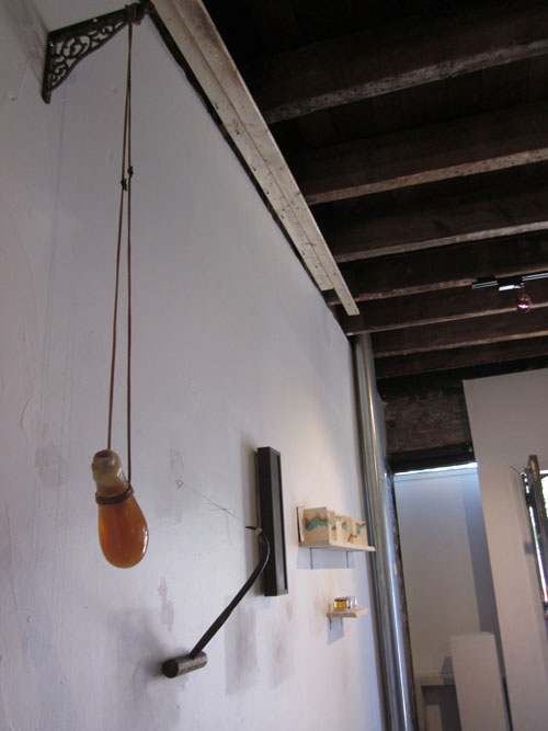 With unlikely combinations such as gears and pool balls or a wooden hook next to a honey-colored glass container hanging from rope, the objects feel familiar but from a different culture or time — tools perhaps or specimens from long-forgotten rituals. Ron Klein’s work with found objects coupled to natural materials comes to mind. (www.ronklein.info) Like Klein, Vegh and Streisguth seek new narratives with their old materials. Surprisingly, Josef Albers is an inspiration for this work, according to the artists. A University of the Arts professor who studied with Albers taught both artists. The Albers influence comes in through the excitement in new combinations, however, not in the artists’ use of color.