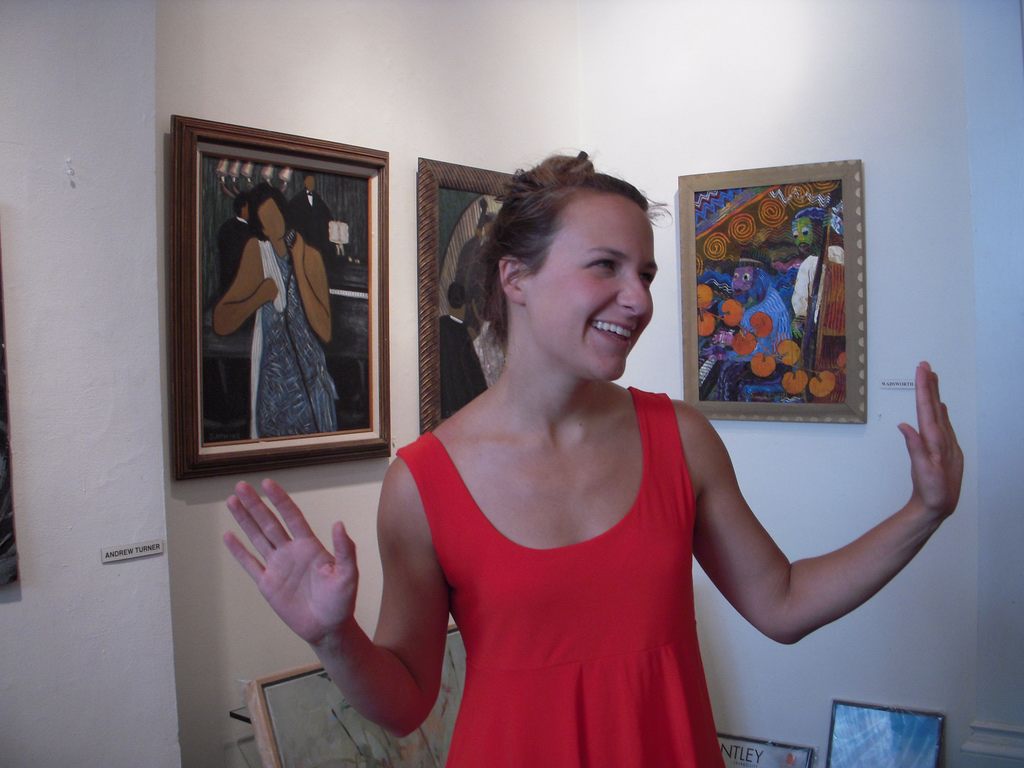 Leslie Rogers sews like a dream and makes costumes she wears in performances that are about gender roles and sometimes are gender bending. She talks about her role in PuppeTyranny, doing puppet shows in her mouth, in which a male collaborator inserts a variety of tiny objects into her mouth and she interacts with them (chewing, spitting out, etc). Exhibitionism, voyeurism and creepy are all on the table for Leslie, who, by the way, has a great laugh and wonderful sense of humor.