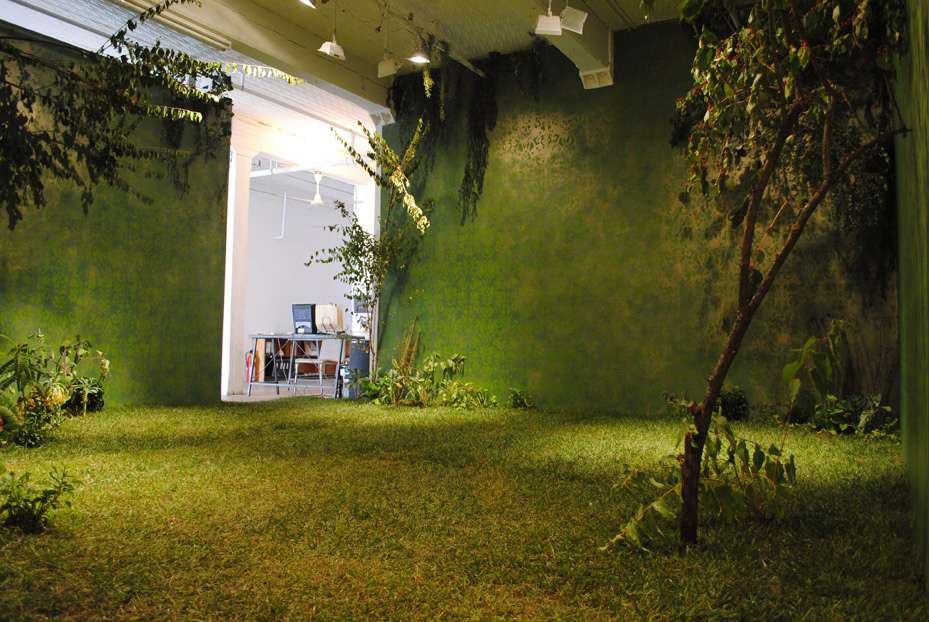 Kate Stewart also has done something new in her Götterdämmerung (translated – end of the world) installation. Enlarging on her familiar theme of domestic comfort and self-delusion amid environmental disaster, she sodded the gallery floor with a layer of dirt and grass that looks and smells like it comes from a city park. Real plants grow inside the walls patterned to suggest dense foliage and rococo decor.