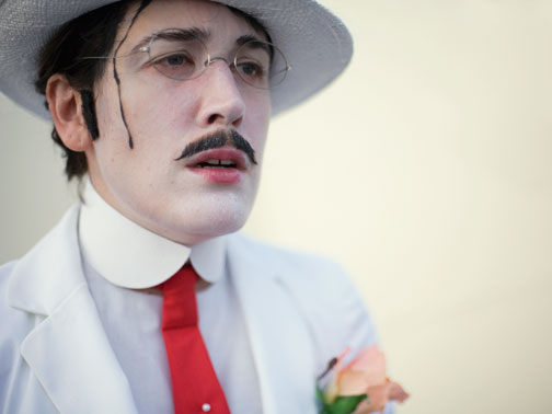Leah Bailis has shifted from austere, architectural niblets of home sweet home to some seriously magical thinking about self-deluding romanticism. The shift from icy cold to ironic panting hot in her show Magical Thinking is shocking and fun and definitely a hit! People buzzing around the opening were delighted with Bailis’ self-portraits in drag, in which she takes a Cindy Sherman turn to capture the final moment of thwarted longing from the movie version of Thomas Mann’s Death in Venice. The faux movie stills undercut the romanticism with foolishness and foppishness at the moment of death–a literal and symbolic heart attack.