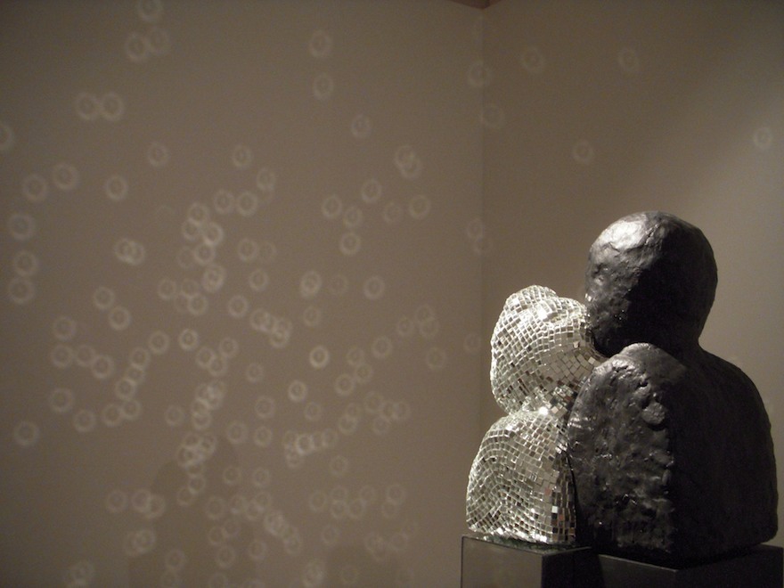 Irony also infuses Bailis’ sculpture of two heads kissing and consuming each other in a creepy over-the-top romanticism. One head has a lively mirror ball surface, the other, a deathstar absorbent black finish. The mirrors scatter a protoplasmic array of circles on the walls of the gallery, bringing to life a quivering, delicate environment for the brooding life vs. death drama of the sculpture. The back story to this sculpture is also from films, inspired by Carl Theodor Dreyer’s Ordet, but the sculpture stands on its own. Bailis was one of last year’s West Prize finalists.