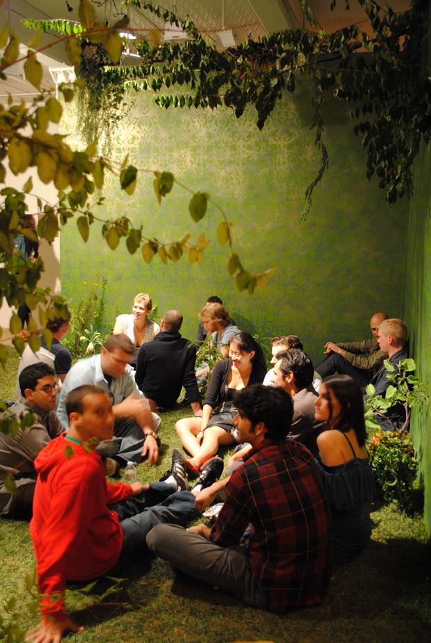 On First Friday, the grass was occupied, wall-to-wall, with gallery goers picnicking and relaxing on the lawn–apres diner sur l’herbe. The crush of humanity in the compressed space further clarifies the nature of the disaster, adding texture to the usual eco themes. Not your usual isolationist survivalism.