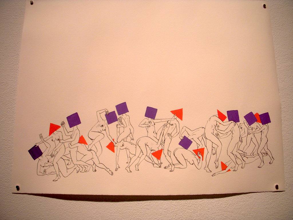 Also at Nexus this month, Anastasia Owell’s Let’s Play, a series of video game hacks in which the evil ogre to beat is the Boss. Much fun. Owell is also showing a couple of odd figure drawings like out-takes from and orgy on a Grecian urn. The drawings, with their intertwined nude bodies, have been decorated by a bunch of squares and triangles that replace the figures’ heads. The formalist elements are confusing and comical, and because the artist is so accomplished at animation, I’m wondering if these are drawings from an animated work.