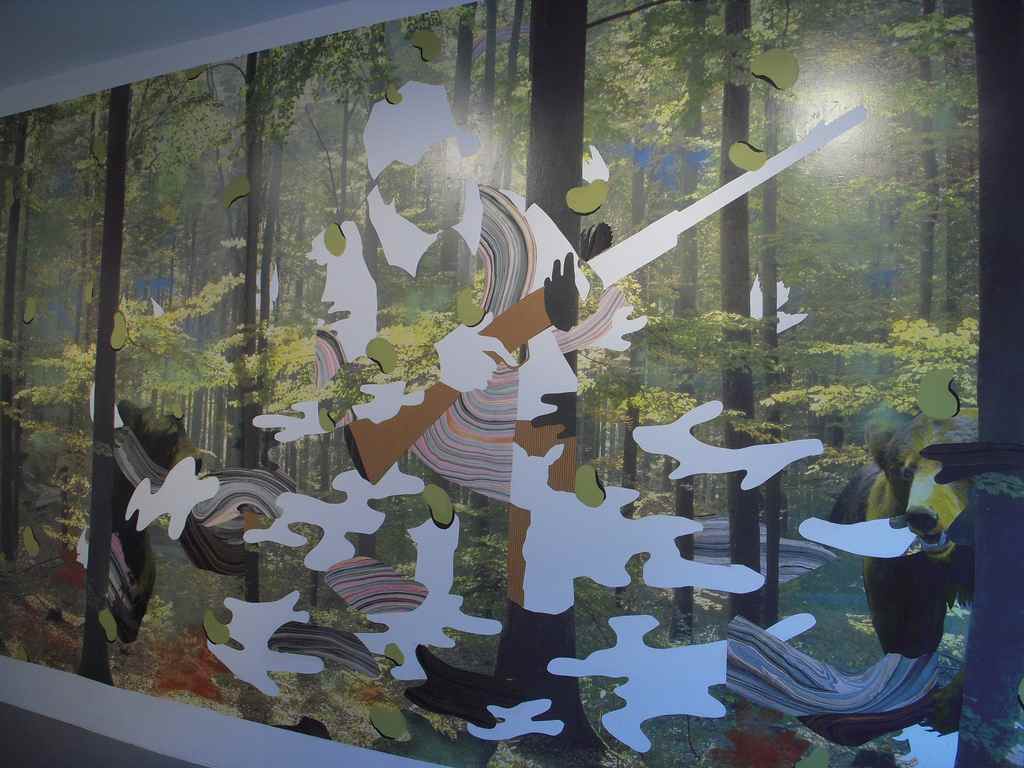 Landscape was a recurring theme that afternoon, with Jackie Hoving’s wall-spanning installation at Rebekah Templeton offering highly-decorated and beautiful camouflage in the forest. Her two works Hunter in Forest and Forest in Hunter are a call and response pair sitting across the room from each other. Hoving’s materials, which include wallpaper, digital prints, acrylic, spray paint and ink, suggest a Cuisinarted approach to imagery in which large holes in the depiction allow the viewer to fill in the blanks. Tom LaDuke’s hole-y narrative paintings at Pafa’s Morris Gallery have a similar affect, although LaDuke’s layering suggests a deep, subliminal layer buried under a bright almost gaudy surface that’s trying to emerge. And Hoving’s works are more unified with layers flattened to suggest a puzzle with pieces missing. (www.rebekahtempleton.com to Dec. 18)