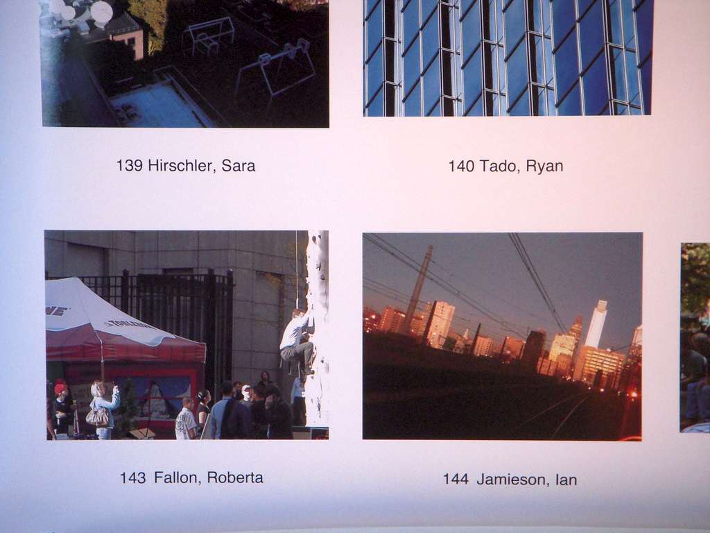 Philly Photo Day, sponsored by Philadelphia Photo Arts Center, was Oct. 28. More than 300 people submitted digital images of Philadelphia to the open call for images. The show is in the Crane’s Grey Area — but today’s the last day to see it. Images of people, animals, babies, architecture, fountains, backyards, abandoned buildings, grafitti. Yup, it’s a pretty comprehensive picture of the city and its people. The works are printed in a grid on large sheets of paper, each image 8×10, and, as Libby pointed out when we were talking about it, this large-format digital printing is a great sample of what PPAC does with its large printers.