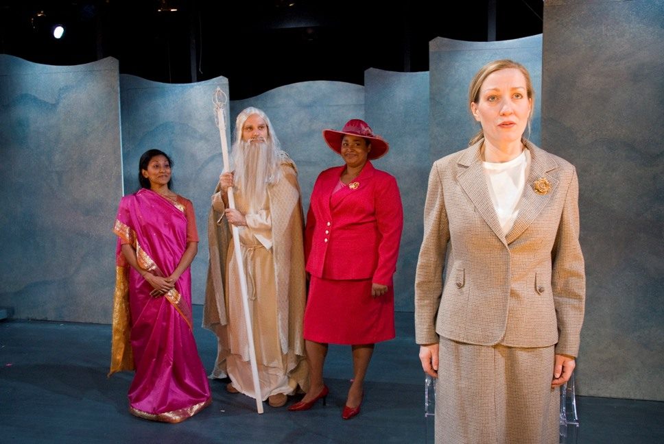 New City Stage’s accomplished cast members morph in and out of their multiple lives and identities with ease. Julie Czarnecki is hysterically funny as the stubborn, long-suffering Miss Witherspoon, and has especially amusing scenes as a newborn baby and a pet dog. Indika Senanayake plays Miss Witherspoon’s wise spiritual guide, Maryamma, with appropriately good-natured calm and patience. Wendy Staton is over the top as Christ in the guise of a gospel-singing, Beatitudes-spouting, African-American woman, and Ginger Dayle and Russ Widdall give sidesplitting performances as both the junkie, and the yuppie parents of the infant Witherspoon’s multiple reincarnations.