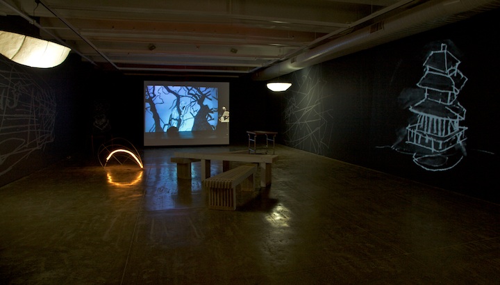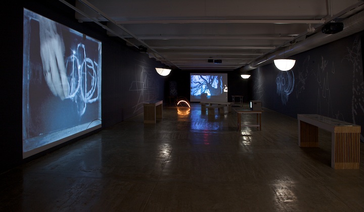Interested in something other than Dante’s words, the acclaimed New York video and performance pioneer takes the words out of the equation, creating instead a dark cave-like underworld with low light, the rumble and tinkle of sound and ambiguous repetitive motions on three video projections. Vitrines contain the artist’s chalk drawings; light sculptures provide dim light, and benches accommodate the weary.