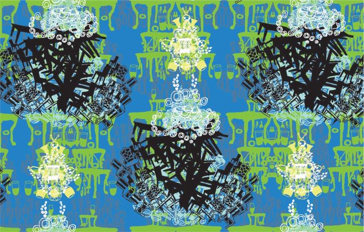 In this project, he is not working with just school children. The group was assembled by MAP. And unlike so many MAP murals of Photoshopped people delivering social propaganda, Volta and his team have taken a more poetic approach, suggesting the spirits and lives of real people who used to live in the missing house. By the simplest of means–12 wallpaper patterns–this mural explores ideas like consumption, waste, memory, loss, time, and even the meaning of life.