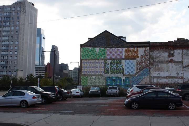 Artist Ben Volta and an 11-artist transgenerational team from the Philadelphia Mural Arts Program were inspired for their mural Home That Was by these traces of domesticity left on the side wall of a condemned rowhouse at 1011 Vine Street. Drawing on household imagery like chairs, tv’s and sofas for a living room, toys for a child’s room, the young and old artists created motifs for faux wallpapers. The new patterns were painted in place of the real faded papers that sometimes cling to the old, thin plaster rectangles that mark the walls. The patterns reward close-up examination with their content as well as their design and coloration (you can see more close-ups on the project’s blog).