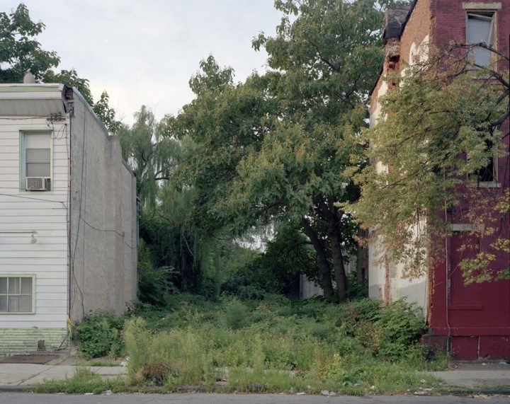 These photographs follow the philosophy behind the Japanese art of Wabi-Sabi – Traub’s work argues that there is beauty in decay and death. Peeling paint, broken windows, worn fabric, plywood, and litter all make a strong image formally. They offer a variety of unusual shapes, striking color combinations, patterns and textures. Since the lots once had buildings on them, or are sandwiched between two houses, it is easy to imagine them as interior spaces. In this situation, the landscape has come inside the space where there was once a house and viewers are reminded of the fragility of our living conditions and our connection to nature.