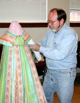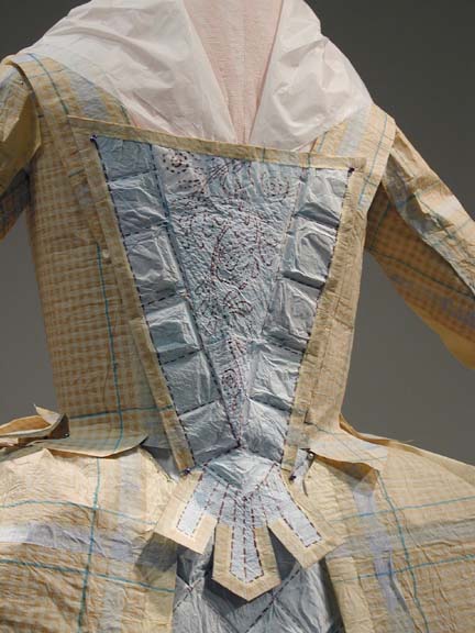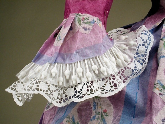 Edward Maeder is the former curator of Costumes and Textiles at the L.A. County Museum of Art and later at historic Deerfield. Maeder has more recently taken up the mantle of artist and “needleman.” His exquisite paper dress creations are made of Q-tips, coffee filters and other found papers. The inspiration for these art objects are 18th-century fashion. The public can view the creation of one of these masterpieces during Edwards Maeder’s MaederMade Pop-Up Studio residency Feb. 5 to 20 in the Green on Greene Building, Greene Street and Carpenter’s Lane, Philadelphia (artist’s talk and workshops information at the bottom of the post). I called Maeder in Connecticut via SKYPE–my first SKYPE interview. It was unsettling.