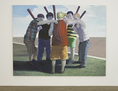Is it cause and effect? Has the Los Angeles-based Vincent been working on these “riot pieces” in anticipation of a break out of street violence in the Middle East (or anywhere else?). Or has his paintings of boys with bats or boys lined up in graphic propaganda style launched a revolution across the Arab world? Try: Neither.