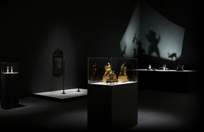 A delightful arrangement of small bronzes in the second area evokes another story from Pliny. Marti has placed table-top versions of classical statuary and various animals by Barye on a high platform, and lit them so they cast dramatic shadows on the walls behind. These looming shadows are the stuff of children’s games and grade-B horror movies, but the tableau also recalls Pliny’s tale of the origin of painting, when Butades of Corinth’s daughter traced her beloved’s silhouette on a wall, to remember him by.