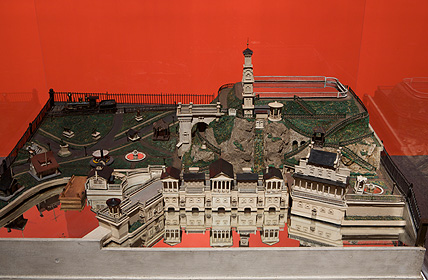 The first object in Marti’s arrangement is a table-top sized model of the Fairmount Waterworks and the reservoir behind it, now the site of the PMA; like all models, it alludes to something else, and the themes of referentiality and illusionism run throughout Set Pieces, where a candlestick refers to a Caryatid; basalt-ware ceramic passes for stone or, when lustred, for metal; and the inlay of a writing-desk features a trompe l’oeil shelf of books.