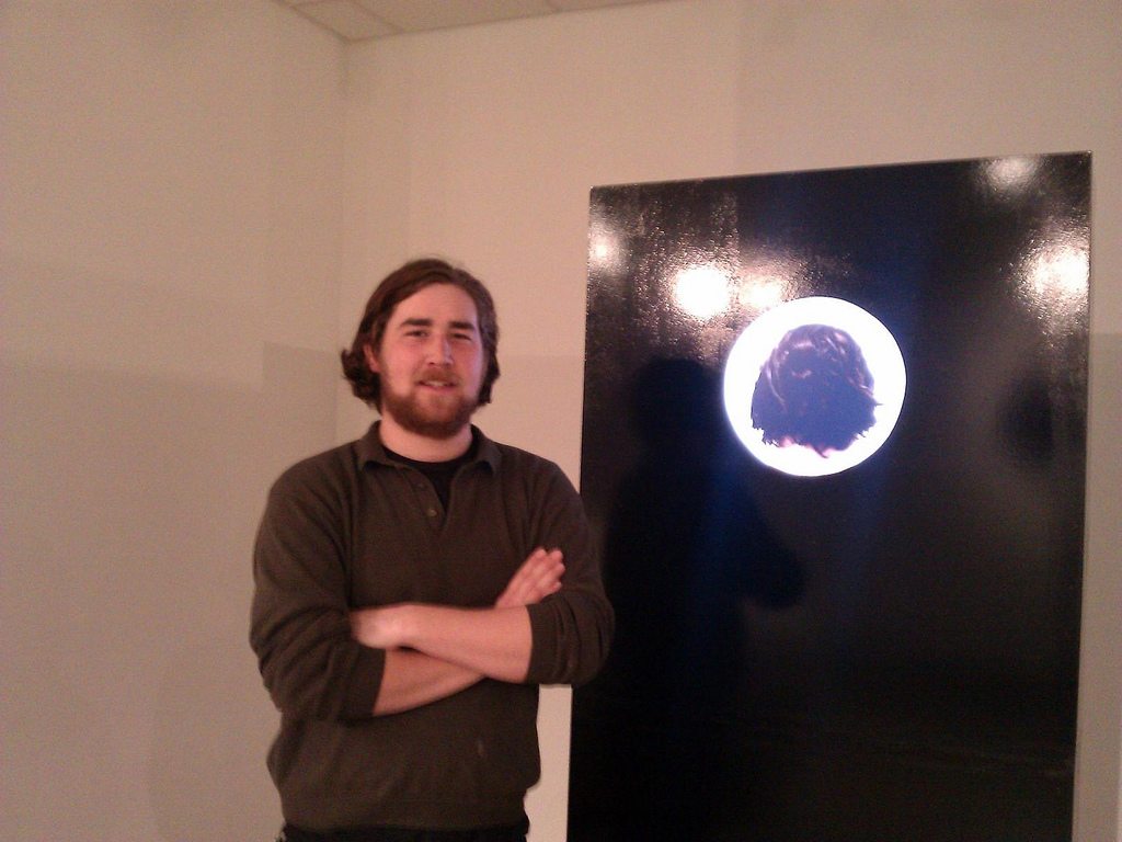 The most impressive of his pieces, a black wooden sarcophagus/stele with a circular cut-out for a video screen, is a sort of self-portrait–of the back of the artist’s head. A small jiggle indicates the screen is video, and the height is Will’s size. The high-gloss surface is reflective enough to mirror the viewer–without providing intimacy.