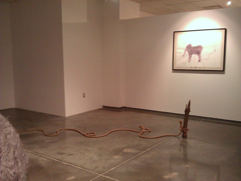The other piece that hit the spot was a stake with a rope, plus a heart-felt image of a young Indian elephant tethered to a stake. Haughery told me that circus elephants when still calves get tied up like this to train them to stay in place. When the rope is eventually removed, the elephants still behave as if they are tethered. The image, in an aqueous medium on unstretched canvas, has a direct, Roberto Clemente-ish approach to shape and medium.