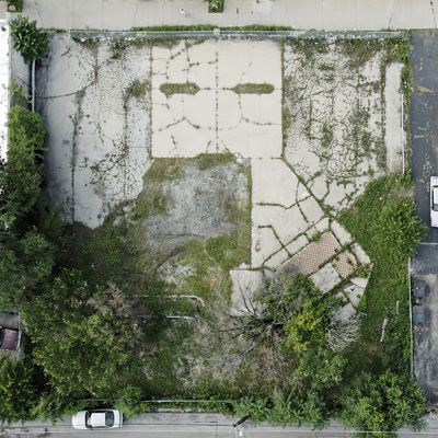 Every one of Gerth’s images, in fact, is rich with graphic detail. Without vertical reference points, shadows read as flat diagonals. Tire tracks in gray sand in Lake & Costner look like the frenzied scribbles of a child as she draws the same circle over and over. In Chicago & Avers, cracks in a cement slab form a rectangular grid that resembles a miniature street grid. The alternating pink-and-black parquet from a leftover patio supplies a splash of warm color amidst green and gray. Lifted from the most mundane of urban realities, these images are quite pleasing as abstract art.