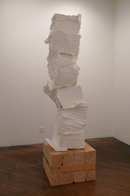 If Gerth’s images turn reality into drawing, Musco’s sculptures make the immaterial concrete—literally. Also a recent M.F.A. graduate (Boston University, 2007) Musco was the recipient of a Pollack-Krasner award for sculptures that play with architectural forms and hard-soft dualities. What seems like a tower of mortar-caked terracotta tiles in Surrounding Walls is actually molded paper pulp. Adding to the deception is the stack of thick timbers that serves as the sculpture’s plinth—as if paper needed a heavy-duty support. In Three-sided Square on Four Walls the same paper pulp poses as a heavy pile of felt sheets, each in a different shade of pink or red.
