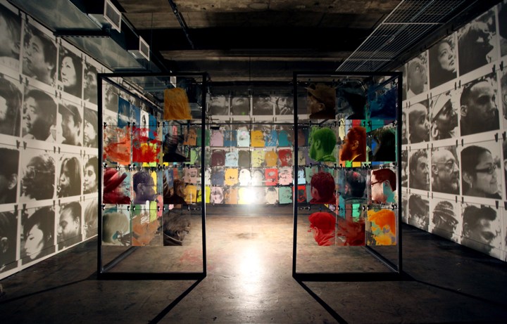 Bohyun Yoon has been taking photographs of the people of Philadelphia . One of them turned out to be my friend Wendy, who was out in Rittenhouse Square walking her standard poodle Nelly when Bo approached. She talked, he talked, and they found out they had me in common. Wendy’s face is now one of the nearly 150 faces that make up Bo’s newest installation–150 different faces that have nothing–and everything–in common.