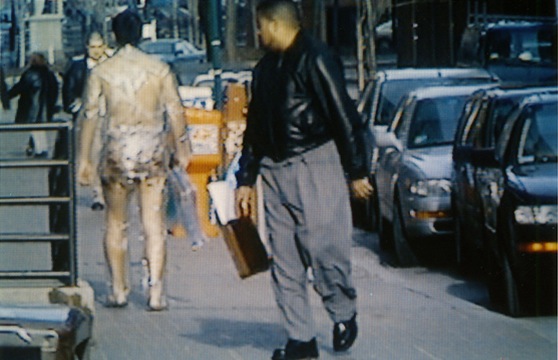 Bo. My parents are happy with what I’m doing. My father is a business man. I really appreciate that he understands me. I always watch him wearing a suit all the time. At RISD I was wearing casual clothing. The clothing is wearing us, not we them. The clothes are controlling you and you not them. I made a transparent business suit and walked in Rhode Island with a vinyl suitcase. I appreciate that my father, my parents, understand me. I made camouflage, vinyl, and a soldier’s glass helmet and gun (in my Two-Year Soldier Project). I made a postcard of me. I made it before joining the army.
