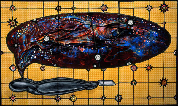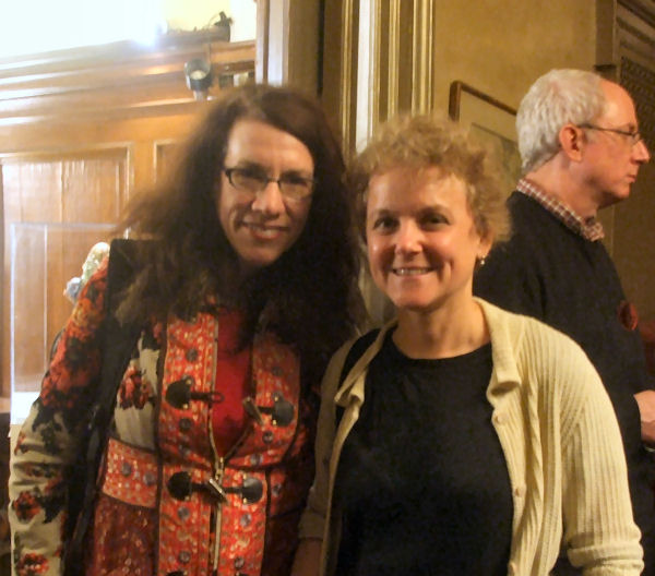 Judith Schaechter reminded me of a cross between rock star Juliette Lewis and Amelie Poulain: a strong, quirky personality with wild, brown locks and fiercely intelligent eyes that even a pair of wire-framed glasses couldn’t quite obscure. I was completely unsurprised upon discovering after a bit of research that her experience-laden past includes a stint as a musician in a local band. The outfit she chose to wear for the occasion, with its warm, earthy tones and bold, floral print, seemed eminently appropriate for a stained glass artist. Bruce Metcalf, an artist who specializes in jewelry, wall reliefs and sculptures, introduced her to the floor as a person of “acid, high anxiety obsessions” with a “profound faith in beauty.”