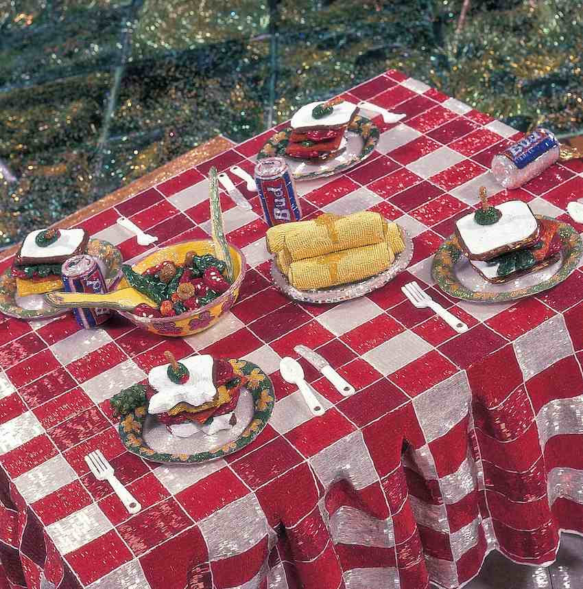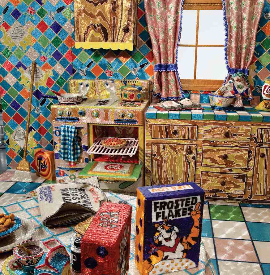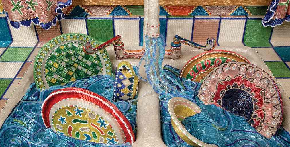 Thirty years after the advent of Pop art, Liza Lou beaded her way into art history, making pop-iconic objects and installations with miraculous numbers of glass beads applied to armatures of plaster, and in some cases, real live things like stoves. Lou labored mightily, and alone at first. Her “Kitchen,” a 168 sq. ft. beaded homage to the domestic took five years to make and 30 million beads (1991-96).