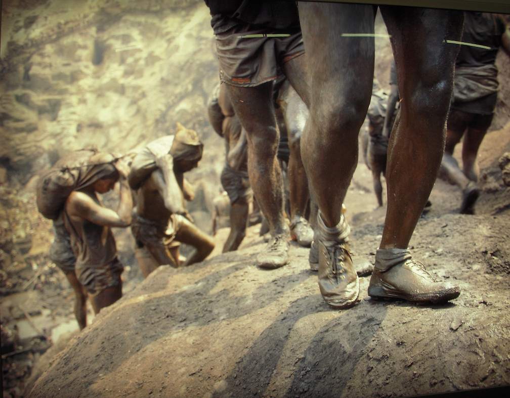 And from still another continent, a terrific Alfredo Jaar lightboxed photo of the glistening legs of a gold miner (Gold in the Morning, 1985-2004, 51.1 x 74.8, at Oliva Arauna, Madrid) standing in his sneakers in the mud was so beautiful and gleaming, it reminded us of a Nike ad.