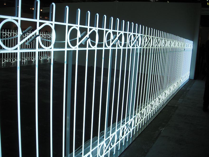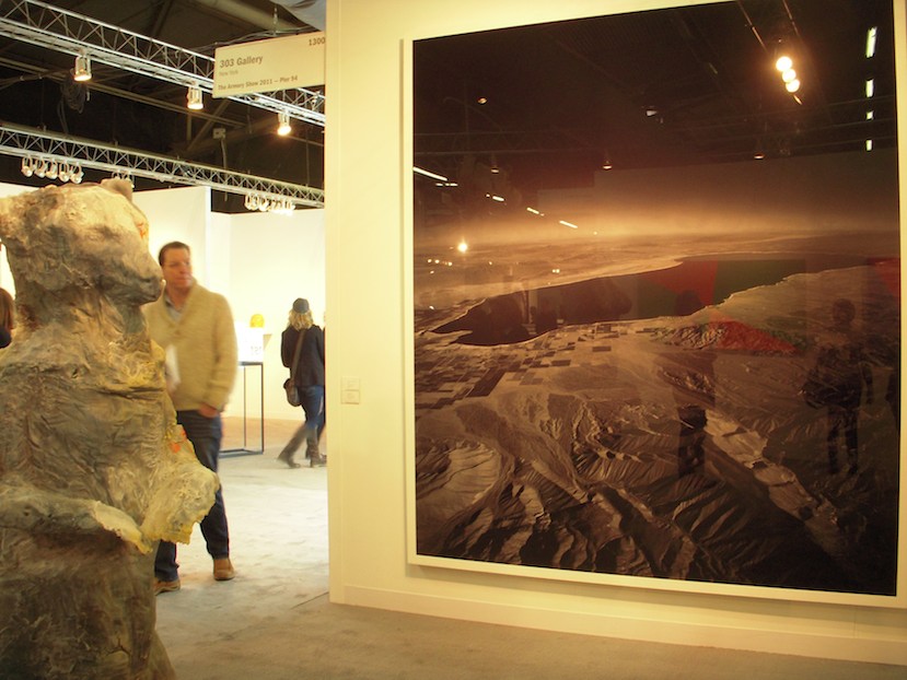 On the whole, we found the Armory Show contemporary pier (Pier 94) to be a disappointing mix. It felt like a cloud of low energy had descended and sucked the life out of the fair. Much of the sculpture and painting we saw seemed uninteresting–at least it didn’t interest us. Mostly photographs and video held our interest. Ivan Navarro’s light fence — which was so bright it might have been there to prevent the onset of SADs in the viewers — was no help. Ten minutes spent near its fluorescent rays contributed to our depression as we wandered around.