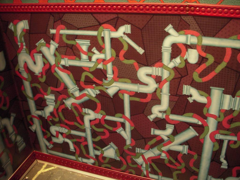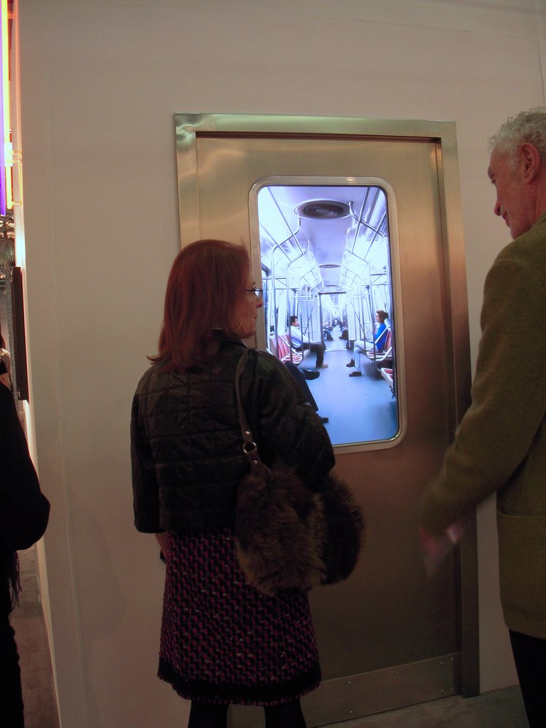 A subway train door was embedded in a wall, and the video screen was the door window. The swaying motion of the train, mixed with the play of perspective into the receding lineup of subway cars–a 1.5 minute loop–was soothing and magical. As in the Robert Wilson video, the slight motion was overwhelmed by stasis. The asking price was $65,000, door included.