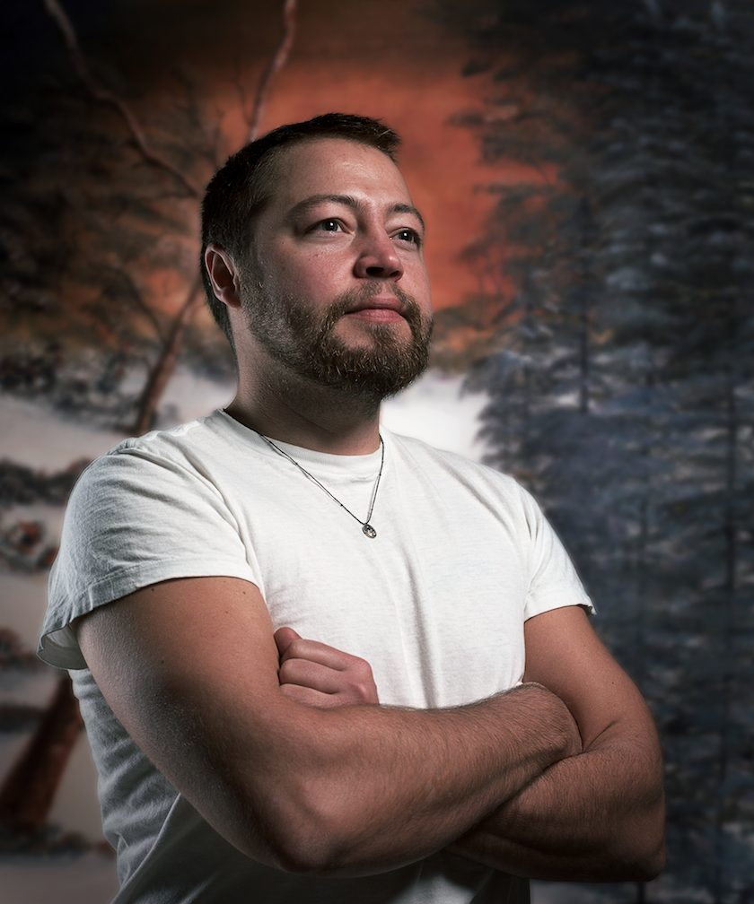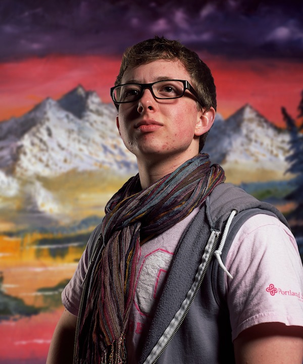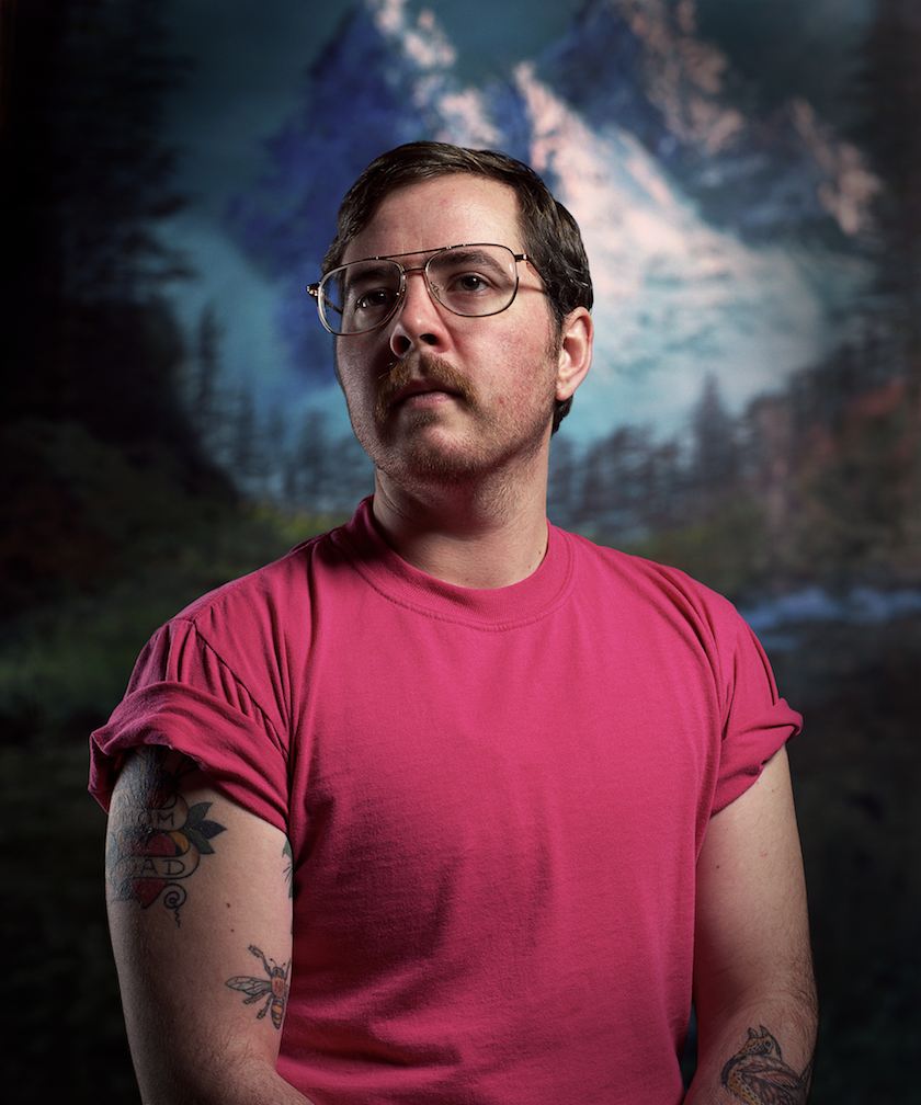 It’s the kitschy backgrounds—the purple mountains majesty, bursting sunsets, glorious deep forests and waterfalls, the pumped-up nature you find in cheesy greeting cards and wallpaper backgrounds for your K-Mart or Sears portrait studio pictures—that really clinch this show. Triburgo successfully pokes fun at the American Dream by combining these transgender heroes with images of nature at its most sublime. Even the titles of the works serve as punchlines in this wry, Steven Colbert-like opus: “Tranquil Dawn (Burton),” “Sunset Aglow (Glenn),” and “Valley Waterfall (Erin).” Triburgo’s point about the truth beneath the picture is as clear as can be. The American Dream is valid for these men even if it doesn’t comply with the red-state vision of heroism.