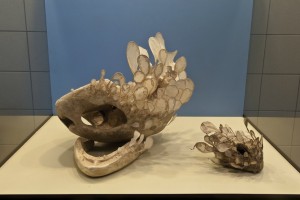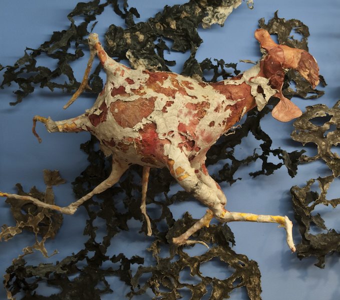 There’s a “sea chicken,” a jaunty reddish creature with multiple legs that seems to be paddling doggy-style. Some shapes look like large open-ended bracelets with heads on each end, inspired, Nickles says, by ancient jewelry. There’s an homage to a giant sea turtle; a little egglike cave colony, some starfish and many biomorphic forms. The artist makes the shapes a variety of ways, mostly by wrapping handmade paper sheets over armatures of recycled Styrofoam or newspaper and then finishing them by smoothing or roughening the surfaces as needed. The starfish have the crusty ambiance of a really great loaf of bread from Sarcone’s. Which is a plus for Nickles, who says she loves food and is happy when her work looks delicious.