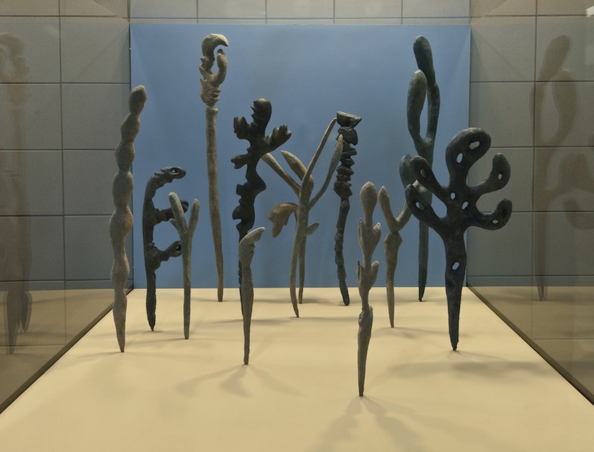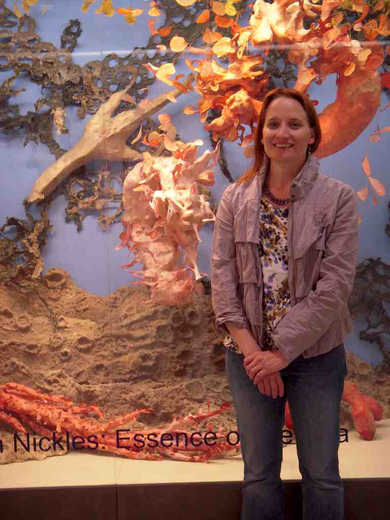 In the terminal, Nickles, who started out as a painter, discusses her work. “When I work with paper I feel connected [to nature],” says the Germantown artist, community gardener and nature lover. “It’s less forced than bronze.” And her love of plants and animals is all over this installation. There’s a memorial to a dead cactus in one long, thin shape; and a group of totemic seaweedlike forms that she calls “plant weapons” for imagined epic underwater battles where the plants need to defend themselves.