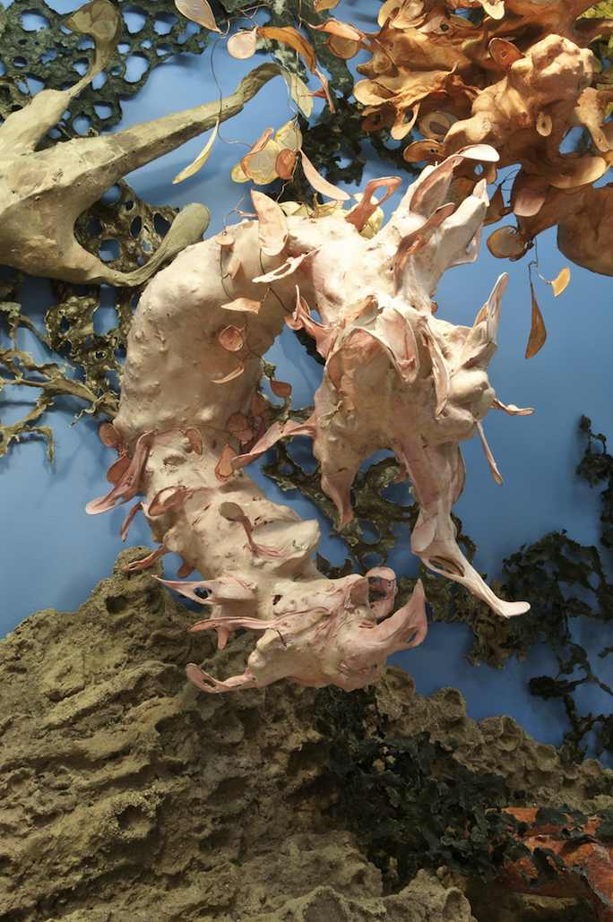 There’s no attempt at realism, although with their aqua-painted backdrop, most everything is believable—and the works could almost be natural history museum dioramas.